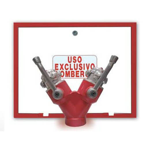 Composta por Aro e Porta IPF-41 (encastrar) ou Caixa IPF-41 (para superfície ou encastrar) metálico pintado em vermelho de medidas 445x590x(300) mm com porta cega pintada de branco e inscrição USO EXCLUSIVO DE BOMBEIROS e fecho de quadrado de 8mm. Bifurcação 70mm com válvulas, entrada 3” x 2 saídas de 70 mm adaptações STORZ UNE-23400 em alumínio estampado.Com tampões.